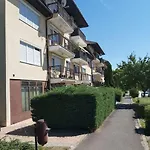 中庭の景色を見渡す広々とした寝室1室のAncsi-Lak Tapolcaアパ-トメントは,タポルツァのタポルツァ洞窟湖からたった0.8キロメ-トルです.